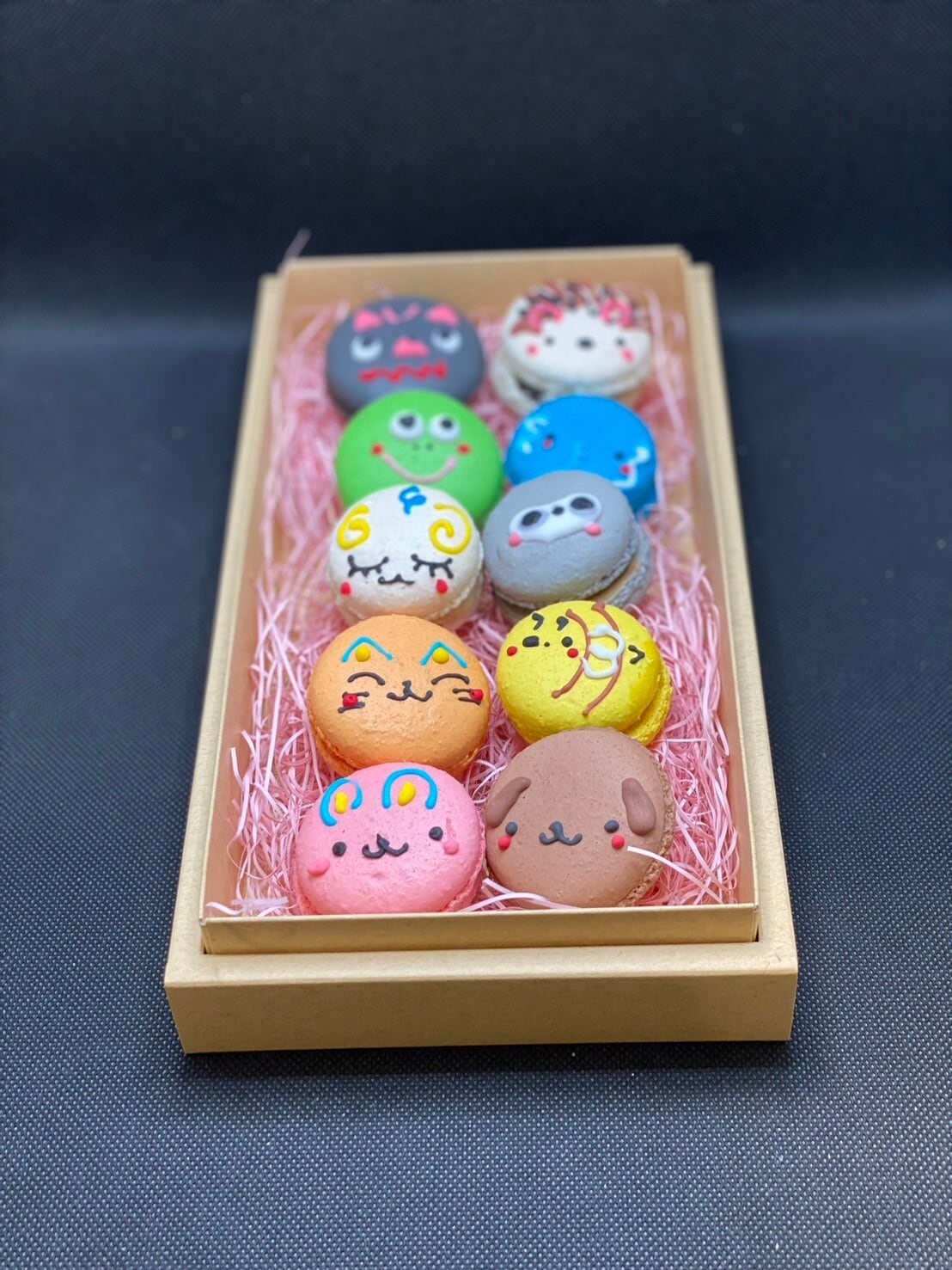 手描きで表情豊かに仕上げられた10個入りのアニマルマカロンは、